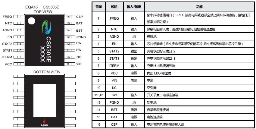 CS5363E是一款20V耐壓,1~4節(jié)鋰電池或1~5節(jié)磷酸鐵鋰電池異步降壓型充電管理IC。 集成功率MOS, 具有最大4A的充電電流能力,充電電流可以通過外部電阻靈活可調(diào)。恒壓充電電壓由外部電阻分壓網(wǎng)絡設置,實現(xiàn)對多類型多節(jié)電池的充電管理。 |