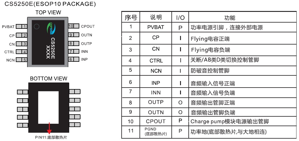 產(chǎn)品名稱: CS5250(無電感電荷泵升壓5.3W防破音單聲道音頻功放IC)