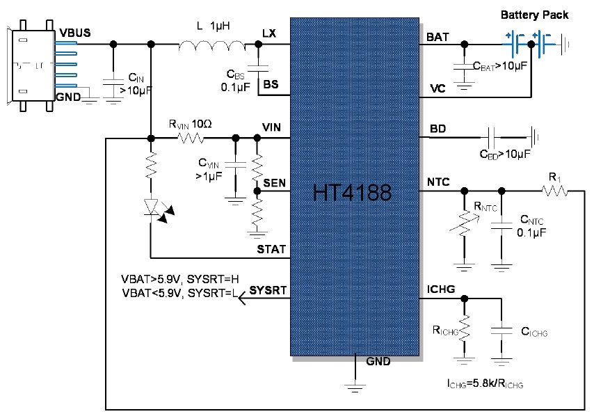 HT4188是一款具有電量均衡功能的5V輸入高效同步升壓型1.2A雙節(jié)鋰電池充電器 |