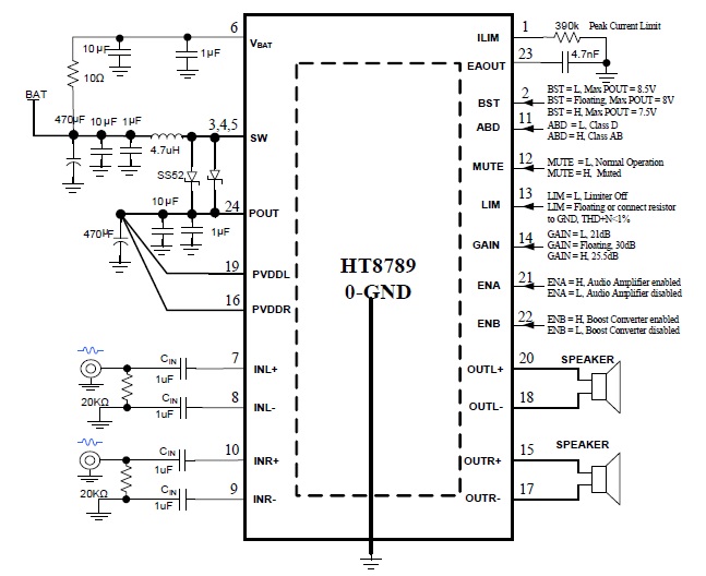 HT8789是一款內(nèi)置自適應(yīng)H類多段升壓的立體聲D類音頻功率放大器,由鋰電池供電升壓至VPOUT=8.5V時(shí), THD+N=1%、1kHz信號(hào)條件下,能連續(xù)輸出2×7W功率(4Ω負(fù)載)。