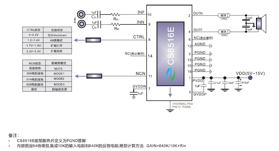 產(chǎn)品名稱: CS8516(應(yīng)用于收音機(jī)的5V-15V寬電壓AB/D類切換功能30W貼片單聲道音頻功放IC)