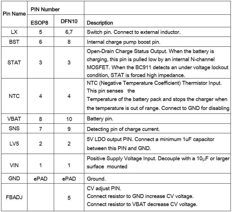 BC911是一款4V-18V寬電壓輸入,支持單節(jié)鋰電池或磷酸鐵鋰電池的降壓充電管理IC。BC911具有3.5A的充電電流能力,充電電流可以通過外部電阻靈活可調, 充電效率可以達到93%以上;恒壓充電電壓可調(電壓點3.2V-5.2V可調,僅限于DFN-10封裝),實現(xiàn)對多類型如單節(jié)鋰電池(4.2V/4.35V/4.4V)、磷酸鐵鋰電池的充電管理。 |