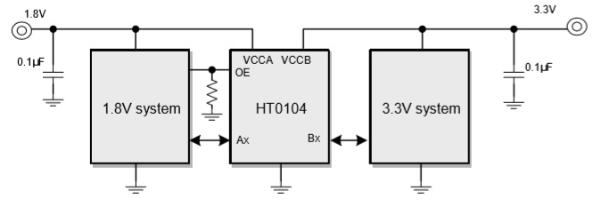 產(chǎn)品功能: HT0104是一款4路雙向電平轉(zhuǎn)換器,其使用兩個獨立的供電VCCA和VCCB。