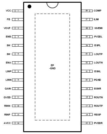 ACM3129 2×57W, 1% THD+N, 24V, 4Ω, BTL ; 1×110W, 1% THD+N, 24V, 2Ω, PBTL TSSOP-28(散熱片在背部,支持外接散熱器) 4.5V-26.4V 2×57W/110W高性能D類音頻功放,超低功耗、展頻功能、動(dòng)態(tài)調(diào)整升壓Class H