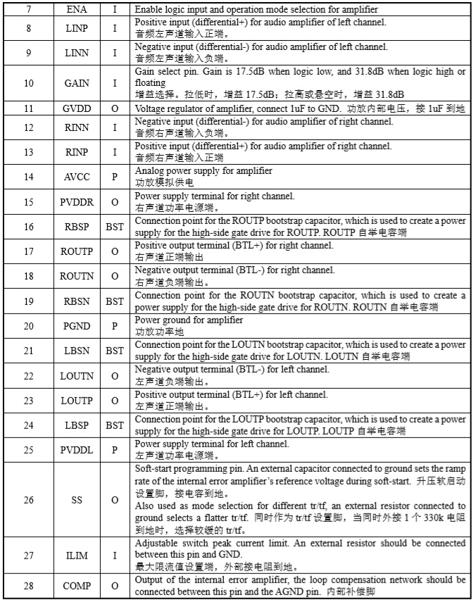 產(chǎn)品功能: 雙鋰電8.4V:2×30W/4歐(VOUT=16V, THD+N= 10%) 或雙鋰電8.4V:52W/3歐(VOUT=17V, THD+N= 10%)