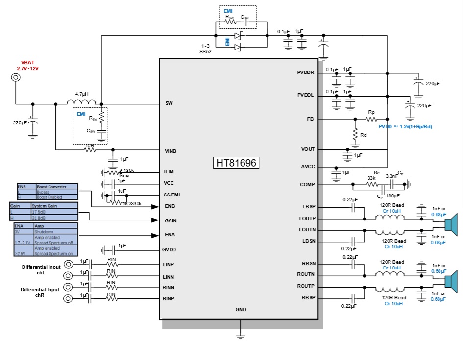 HT81696是一款內(nèi)置升壓的立體聲D類音頻功率放大器,其支持單節(jié)鋰電、雙節(jié)鋰電串聯(lián)、 5V、12V等多種輸入,升壓后的電壓提供給功放供電,功放支持雙通道立體聲BTL輸出以及并聯(lián)PBTL單聲道輸出。 HT81696內(nèi)置的升壓電路,可通過FB腳設(shè)置升壓值,以滿足不同的輸出功率需求。其還可通 過外置電阻調(diào)節(jié)開關(guān)峰值電流限值。 此外,HT81696內(nèi)部集成免濾波器調(diào)制技術(shù),能夠直接驅(qū)動(dòng)揚(yáng)聲器,內(nèi)置的關(guān)斷功能使待機(jī)電流最小化,還集成了輸出端過流保護(hù)、片內(nèi)過溫保護(hù)、輸入電源欠壓異常保護(hù)、升壓電壓過壓保護(hù)等功能。