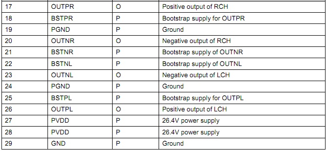 2×14W, 立體聲輸出(4Ω, 12V, THD+N = 1%); 2×10.5W, 立體聲輸出 (6Ω, 12V, THD+N = 1%) |