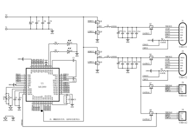 M12359 是一款面向大功率快充應(yīng)用的電源管理 SOC,集成了微處理器、雙路降壓變換器、快充協(xié)議控 制器,支持 PD3.1、QC3.0、QC2.0、SCP、FCP、AFC 等主流快充協(xié)議。結(jié)合少量元件即可組成雙路獨(dú)立的降 壓型 140W 多口大功率快充解決方案。 |