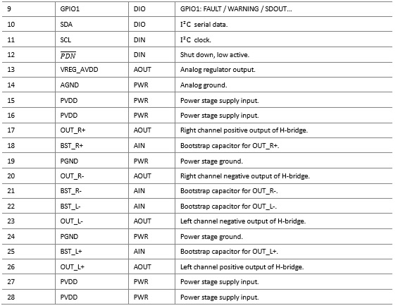 2×26W立體聲/52W單聲道、內(nèi)置DSP虛擬低音等多種音頻處理效果、數(shù)字輸入音頻功放芯片 |
