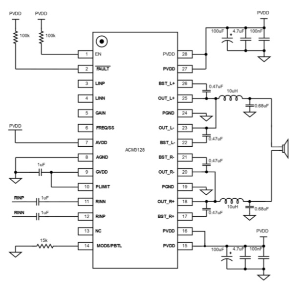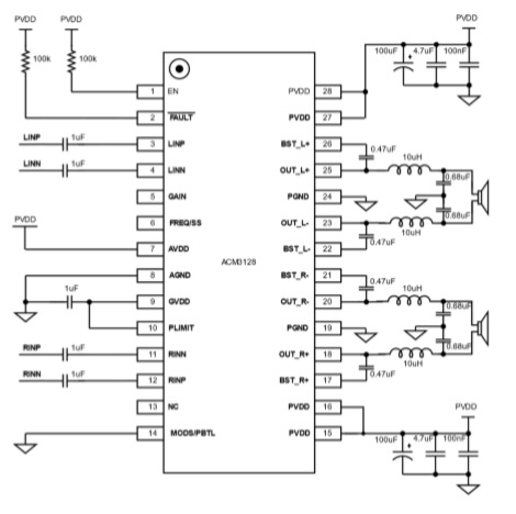 ACM3129 2×57W, 1% THD+N, 24V, 4Ω, BTL ; 1×110W, 1% THD+N, 24V, 2Ω, PBTL TSSOP-28(散熱片在背部,支持外接散熱器) 4.5V-26.4V 2×57W/110W高性能D類音頻功放,超低功耗、展頻功能、動(dòng)態(tài)調(diào)整升壓Class H