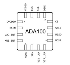 該電路適用于有 I2C 或 SPI 通信的方案,最大支持 30 個(gè)關(guān)鍵詞的識(shí)別,當(dāng)有語(yǔ)音時(shí),VADINT(PIN3)輸 出高脈沖指示檢測(cè)到人聲;當(dāng)識(shí)別到關(guān)鍵詞時(shí),KWSINT(PIN4)輸出一個(gè)納秒級(jí)別的脈沖,提示此時(shí)該讀取 ADA100 寄存器,提取識(shí)別到的關(guān)鍵詞。