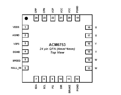 ACM6753 18V、3A三相無刷無感驅(qū)動、180˚正弦,集成驅(qū)動算法+預(yù)驅(qū)+MOS QFN-24 5V-18V 5-18V無感三相無刷電機(jī)驅(qū)動器 ACM6754
