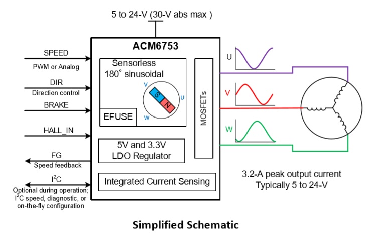 ACM6753是一款18V/3A三相無感BLDC(無刷直流)電機(jī)驅(qū)動IC、180˚正弦,集成驅(qū)動算法+預(yù)驅(qū)+MOS ,內(nèi)置電流檢測。