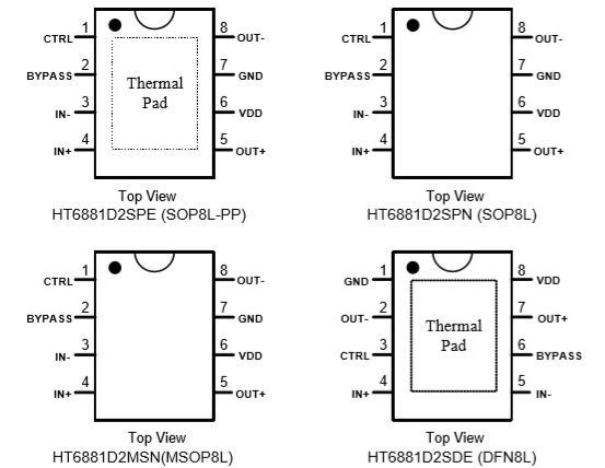 HT6881 1.4W (VDD=3.6V, RL=4Ω, THD+N=10%, Class D) DFN-8L/MSOP-8/ SOP-8/SOP8-PP 2.5V-6.5V 2.65mA低待機功耗2.8W單聲道D類功放IC TPA2005