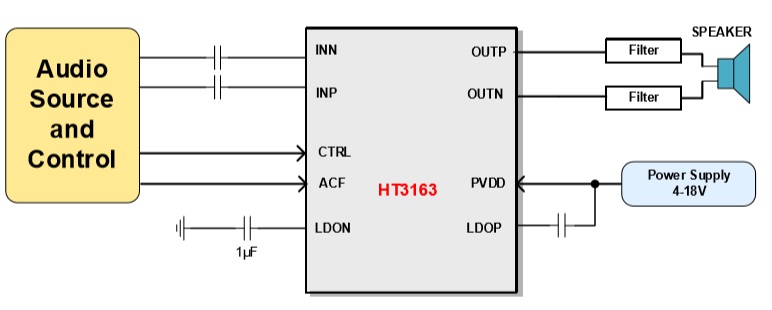 HT3163具有防削頂失真(ACF)輸出控制 功能,可檢測(cè)并抑制由于輸入音樂(lè)、語(yǔ)音信號(hào) 幅度過(guò)大所引起的輸出信號(hào)削頂失真(破音), 也能自適應(yīng)地防止在電源電壓下降所造成的輸 出削頂,顯著提高音質(zhì),創(chuàng)造非常舒適的聽(tīng)音 享受,并保護(hù)揚(yáng)聲器免受過(guò)載損壞。
