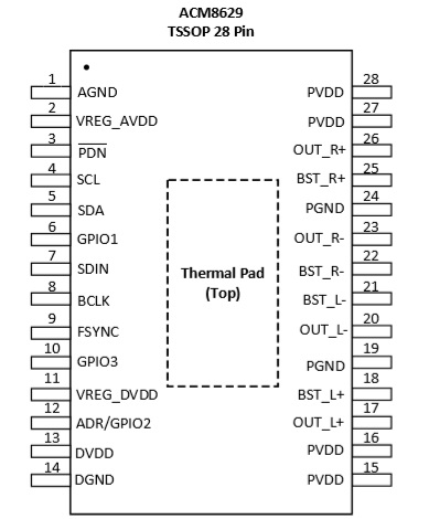 ACM8623 2×14W, 立體聲輸出(4Ω, 12V, THD+N = 1%); 2×10.5W, 立體聲輸出 (6Ω, 12V, THD+N = 1%) TSSOP-28 4.5V-15.5V I2S輸入15W雙聲道數(shù)字功放IC ACM8622/ACM8625M/ACM8625P/ACM8625S/ ACM8685/ACM8628/TAS5805/AD82128