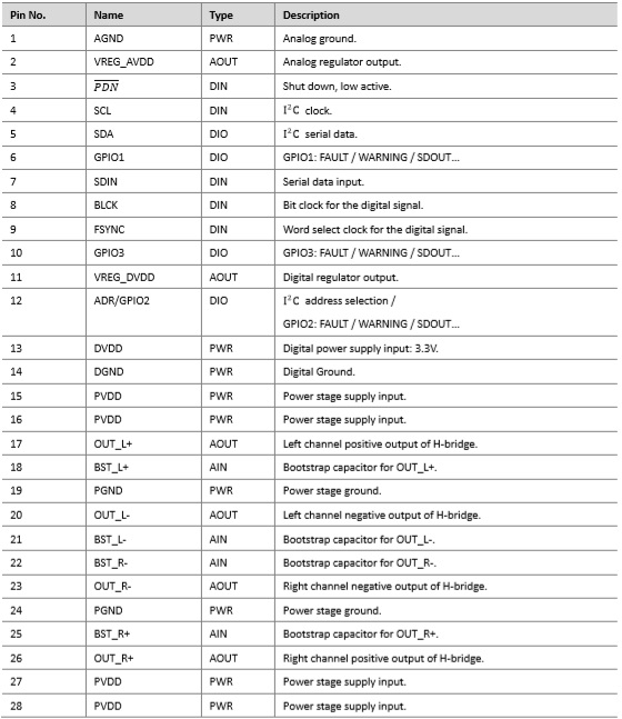 - THD+N ≤ 0.03% :1W, 1kHz, PVDD = 12V