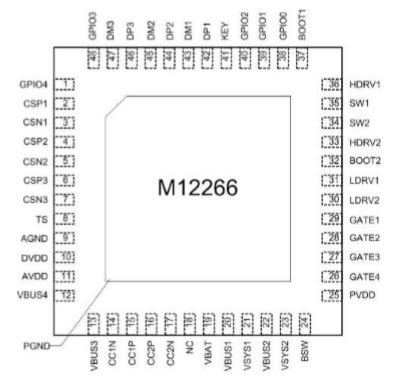 產(chǎn)品名稱: M12266(內(nèi)置PD3.0/QC3.0等協(xié)議、3-6串多節(jié)電池充放電管理的移動電源雙向快充IC)