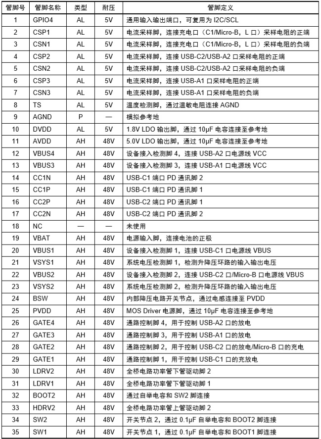 M12266 M12266是一款面向多串電芯大功率移動電源應(yīng)用的專用SOC,集成了同步升降壓電壓變換器、電池充放電管理模塊、顯示模塊、電量計算模塊,提供最大100W輸入/輸出功率,支持 PD3.0、QC3.0、AFC、FCP、 SCP、BC1.2 DCP等主流快充協(xié)議,并提供輸入/輸出的過壓/欠壓、電池過壓/欠壓、過充/過放、NTC 過溫、放電過流、輸出短路保護(hù)等完備的保護(hù)功能。配合極簡的外圍電路,即可組成100W多口移動電源。 QFN-48 3.3V-30V 多串單路PD3.0移動電源SOC M12269