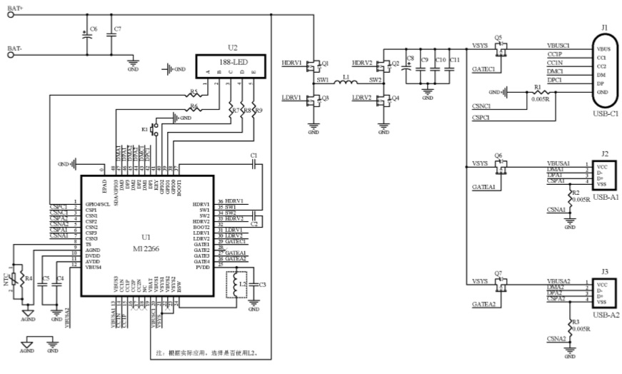 M12266是一款面向多串電芯大功率移動電源應(yīng)用的專用SOC,集成了同步升降壓電壓變換器、電池充放電管理模塊、顯示模塊、電量計算模塊,提供最大100W輸入/輸出功率,支持PD3.0、QC3.0、AFC、FCP、 SCP、BC1.2 DCP 等主流快充協(xié)議,并提供輸入/輸出的過壓/欠壓、電池過壓/欠壓、過充/過放、NTC過溫、放電過流、輸出短路保護(hù)等完備的保護(hù)功能。配合極簡的外圍電路,即可組成100W多口移動電源。