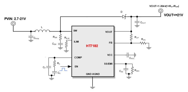 HT7182具有2.7V至21V寬輸入電壓范圍,可為采用1-4節(jié)鋰電池,或12V鉛酸電池的應(yīng)用提供支持。該器件具備14A開關(guān)電流能力,并且能夠提供高達(dá)21V的輸出電壓。
