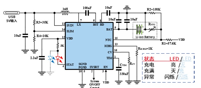 ■ LED指示燈使用時需接限流電阻到VDD,推薦3K。如需使用雙燈方案,必須按照圖中LED燈顏色配置,請購買對應顏色LED燈進行實驗,充 電時紅燈亮,藍燈滅;充滿時藍燈亮,紅燈滅;異常時紅燈藍燈交替閃爍。