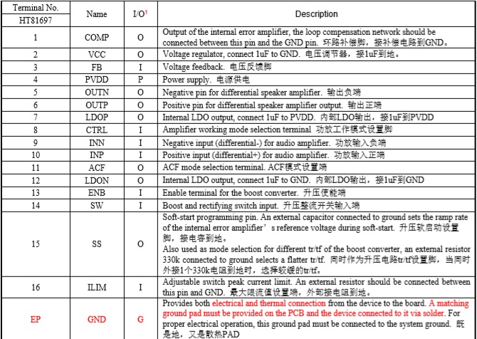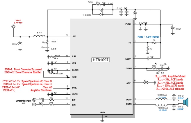 HT81697具有先進的擴頻功能來抑制EMI。如果系統(tǒng)對EMI高度敏感,則可以將升壓關閉,并將功放切換到AB類。 此外,HT81697集成了輸出端過流保護、片內過溫保護、升壓過壓保護等功能。