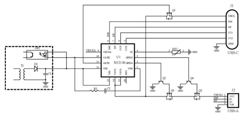 M12150是一款支持PD3.1的雙口全兼容快充協(xié)議IC,集成了微處理器、USB Type-C 接口、快充協(xié)議控制器、高精度電流采樣電阻,支持DFP/Source功能。利用TL431和光耦組成的反饋電路調(diào)整前級(jí)AC-DC的輸出電壓,搭載極少的元件可以組成C口協(xié)議調(diào)壓、A口降壓的 C+A獨(dú)立雙口功率可分配的快充解決方案。 |