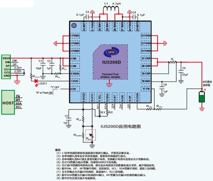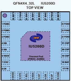 IU5200D支持I2C接口來(lái)控制充電過(guò)程的各個(gè)細(xì)節(jié)參數(shù),包括電池節(jié)數(shù)以及規(guī)格。采用QFN4X4_32L封裝。
