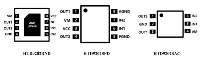 HTD9202提供三種封裝形式,一種是帶有散熱焊盤的 DFN8(2mm×2mm) 封裝,另兩種是SOP8和SOT23-6封裝,均是無鉛產(chǎn)品,符合環(huán)保標準。