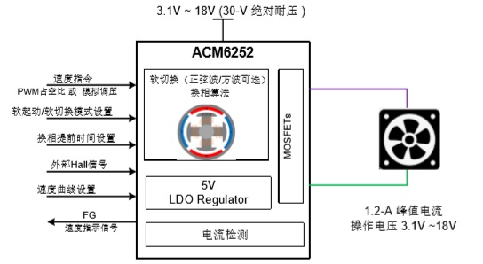 ACM6252是一款內(nèi)置H橋功率MOS管的單相無刷電機(jī)驅(qū)動芯片. ACM6252支持可以調(diào)整的速度曲線,正弦波驅(qū)動保證直流風(fēng)扇靜音高效.