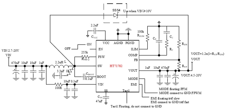 HT71782具有2.7V至20V寬輸入電壓范圍,可為采用單節(jié)或兩節(jié)鋰電池的應(yīng)用提供支持。該器件具備15A開關(guān)電流能力,并且能夠提供20V的輸出電壓。