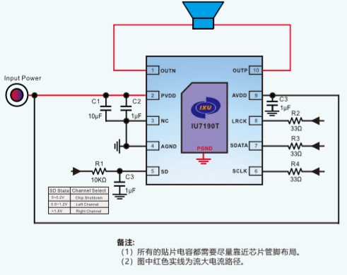 IU7190T為單聲道音頻功放。但通過SD管腳設(shè)置不同的電平,可以進(jìn)行左右聲道的選擇。因此可同時(shí)選用兩顆芯片,靈活地組成立體聲產(chǎn)品。IU7190T內(nèi)置了過流保護(hù),短路保護(hù)和過熱保護(hù),有效的保護(hù)芯片在異常的工作條件 下不被損壞。IU7190T提供了纖小的DFN2X2_10L封裝形式可供客戶選擇,其額定的工作溫度范圍為-40℃至85℃。