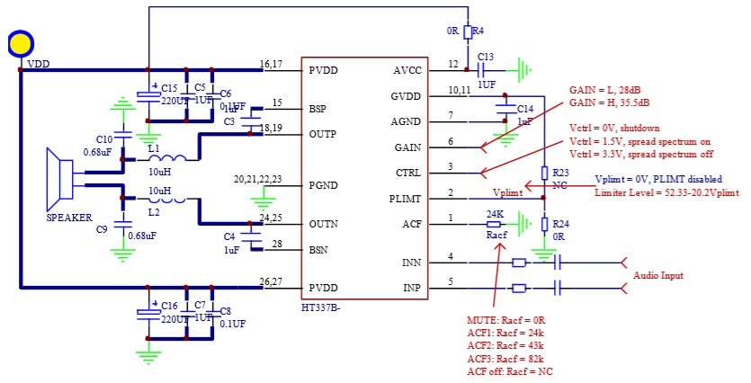 此外,HT337B內(nèi)置關(guān)斷功能使待機(jī)電流最小化,還集成了短路保護(hù)、熱保護(hù)和電源欠壓異常保護(hù)等功能。