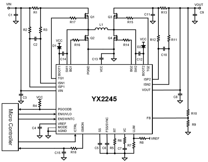 YX2245是一款同步升降壓控制器,適用于驅(qū)動(dòng)高效電源轉(zhuǎn)換器中的MOSFET或氮化鎵(GaN)等功率器件。它支持高達(dá)45V的寬輸入和輸出電壓范圍, 并可在降壓、升降壓和升壓模式之間無縫轉(zhuǎn)換。 YX2245集成了具有UVLO保護(hù)功能的上管和下管柵極驅(qū)動(dòng)器。它提供可編程電感峰值電流限制和輸出平均電流限制功能,并通過ISMON提供輸出瞬 時(shí)電流監(jiān)控功能。CC/CV 調(diào)節(jié)功能使其適用于電池充電系統(tǒng)。