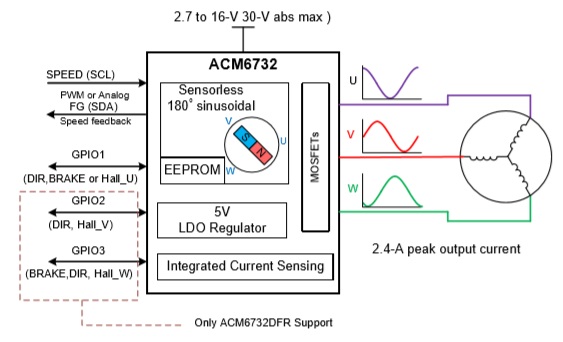ACM6732支持 180゜正弦驅(qū)動,有效避免因高次諧波導(dǎo)致的電磁音干擾.也支持方波驅(qū)動,適用于快速啟動大扭矩的應(yīng)用場景。  ACM6732可以根據(jù)用戶提供的電機參數(shù)進行有效啟動、加速以及恒轉(zhuǎn)速或者電壓運行.用戶參數(shù)可以通過燒寫長期固定(其中). ACM6732支持多種速度控制.外部 PWM 占空比調(diào)速、外部模擬電壓調(diào)速以及外部 PWM 頻率調(diào)速.