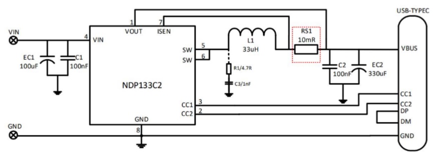 NDP133C2KC集成USB PD3.1快充協(xié)議,能自動(dòng)檢測(cè)連接到USB端口的受電設(shè)備,以及自動(dòng)調(diào)整輸出電壓。