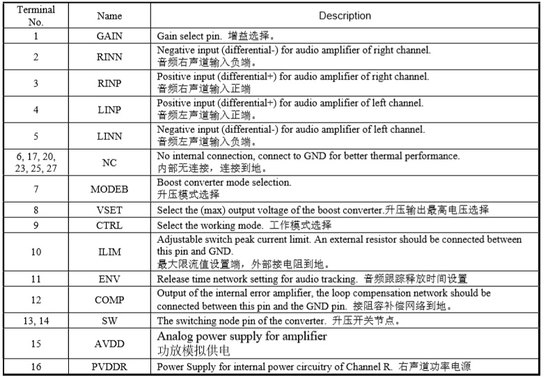 HTA8998內置的升壓電路,可通過VSET腳設置最大升壓值,以滿足不同的輸出功率需求。 其還可通過外置電阻調節(jié)開關峰值電流限值。