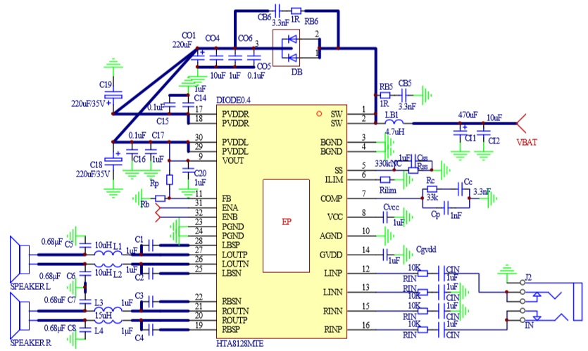 此外,HTA8128內部集成免濾波器調制技術, 能夠直接驅動揚聲器,內置的關斷功能使待機電流最小化,還集成了輸出端過流保護、片內過溫保護、輸入電源欠壓異常保護、升壓電壓過壓保護等功能。