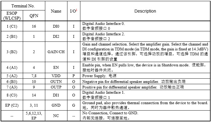 - I2S (輸出左、右或左/2+右/2可選擇), 16bit, 24bit 或 32 bit; TDM 輸入,16bit或32bit