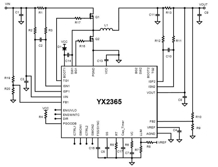 在降壓模式下,它支持高達(dá)65V的寬輸入和輸出電壓范圍。YX2365 集 成了具有欠壓鎖定(UVLO)保護(hù)的高壓側(cè)和低壓側(cè)柵極驅(qū)動(dòng)器。它提供可編程的電感器峰值電流限制和輸入/輸出電流限制功能,以及通過(guò)ISMON 1和 ISMON2進(jìn)行實(shí)時(shí)輸出電流監(jiān)控。CC/CV(恒 流/恒壓) 調(diào)節(jié)功能使其適用于電池充電系統(tǒng)。 此外,YX2365還包括一個(gè)外部可編程電池充電定時(shí)配置。