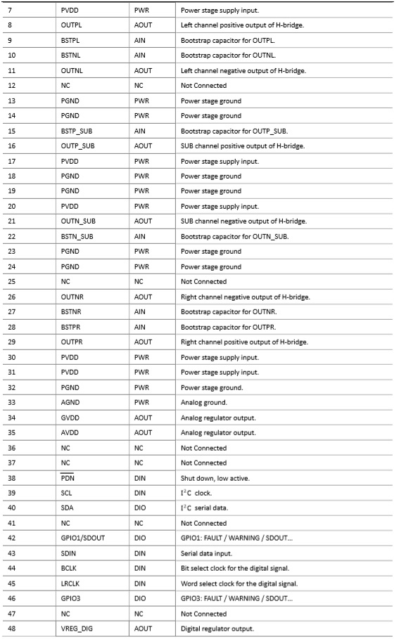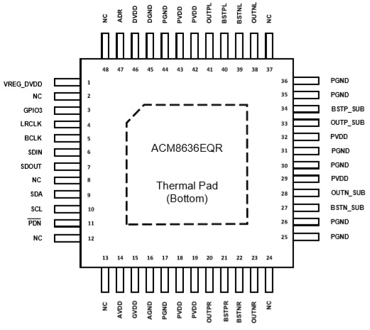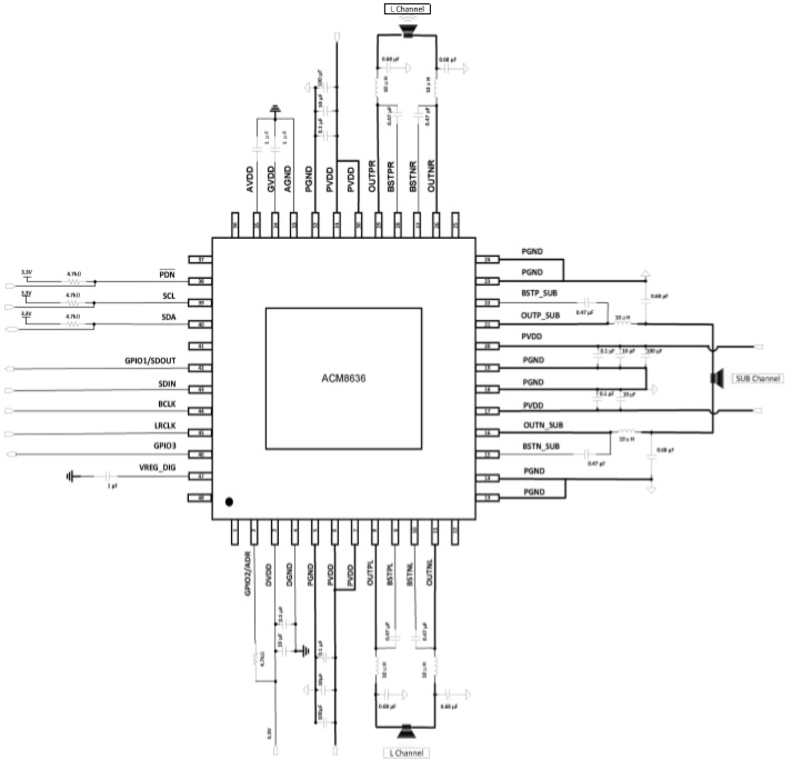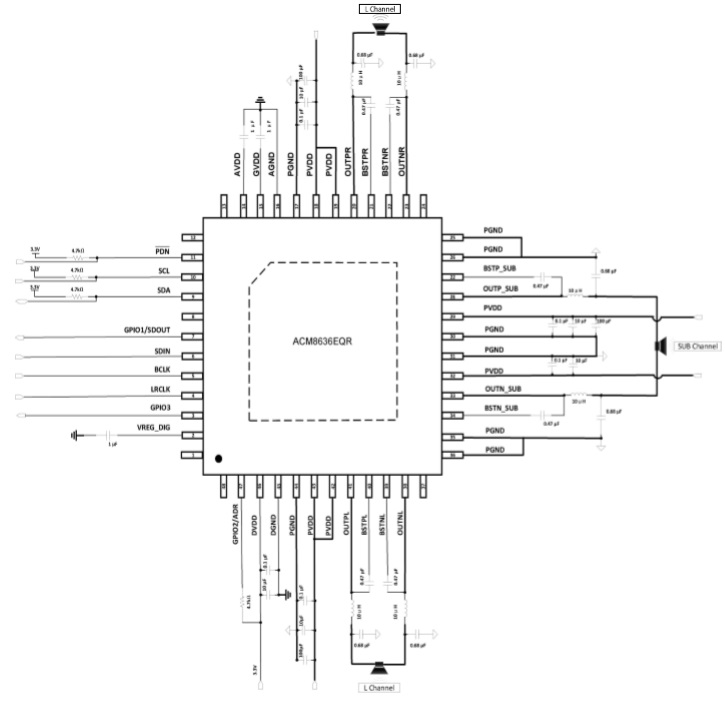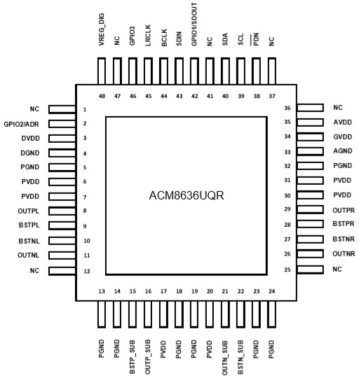ACM8636一款2.1通道數(shù)字輸入音頻功率放大器。供電電壓范圍在 4.5V-26.4V。在2.1通道工作模式, 2 x 8 歐+4 歐負(fù)載下,輸出功率可以達(dá)到2×30W+60W ; THD+N不超過(guò)1%。