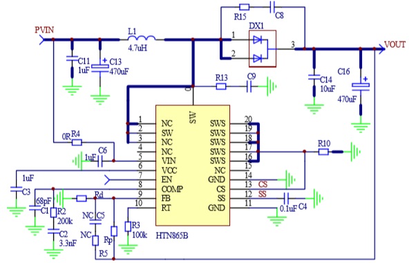 HTN865B具有2.8V至36V寬輸入電壓范圍,可為不同應(yīng)用的不同供電方式提供支持。該器件具備20A開(kāi)關(guān)電流能力,并且能夠提供高達(dá)36V的輸出電壓。