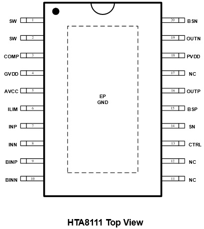 HTA8111 18W (VBAT=3.7V, RL=4Ω, THD+N=10%, fIN = 1kHz) TSSOP-20 3.0V-12V 18W內(nèi)置升壓單聲道D類音頻功放