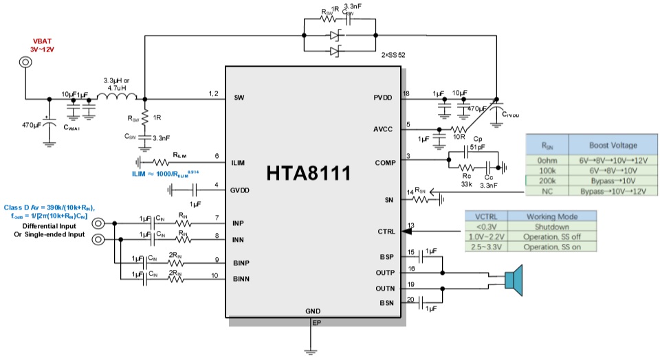 HTA8111內(nèi)置可動態(tài)調(diào)節(jié)的升壓,可以提供一個適應(yīng)不同輸出功率的電壓給D類功放,其可大幅提高系統(tǒng)效率,延長電池續(xù)航時間。