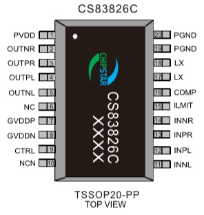 CS838826C提供了纖小的的TSSOP20-PP封裝形式供客戶選擇,其額定的工作溫度范圍為-40℃至85℃。
